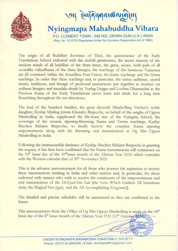 Announcing the Kama Transmissions To Be Bestowed by Kyabje Shechen Rabjam Rinpoche at Mindrolling Monastery – 2025 October 11, 2024