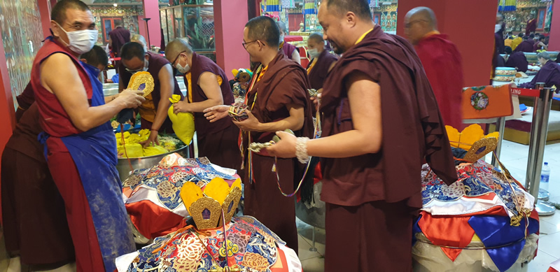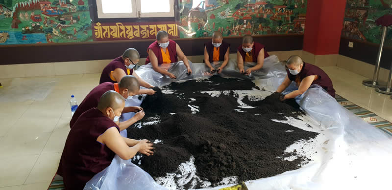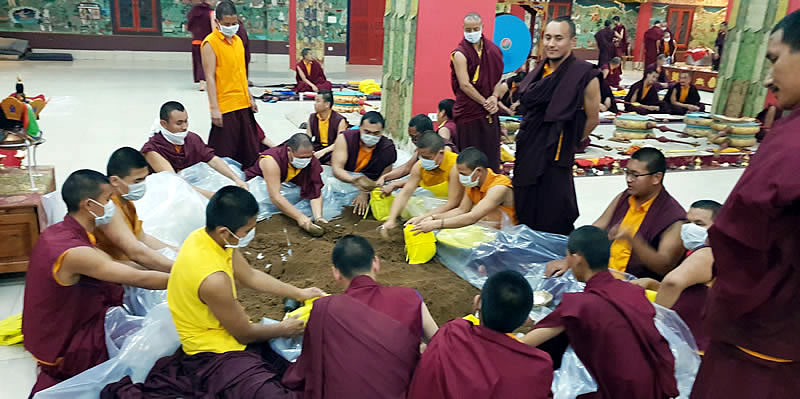 This year the preparation and accomplishment of the mendrub practice was also done during the Kagyed drubchen. Mendrub, also known as sacred medicinal pills or amrita pills, are prepared in accordance with sacred rituals and accomplished within the context of a drubchen. Hundreds of precious medicinal herbs and relics are gathered together and the sacred pills are then made as instructed in the ritual of making and accomplishing these precious pills. This year in Mindrolling during the Kagyed drubchen, mendrub was made with the greatest care and respect for the traditions as laid out by the great masters of the past under the direction of His Eminence Khochhen Rinpoche and Lopon Tenpa Gyaltshen la.