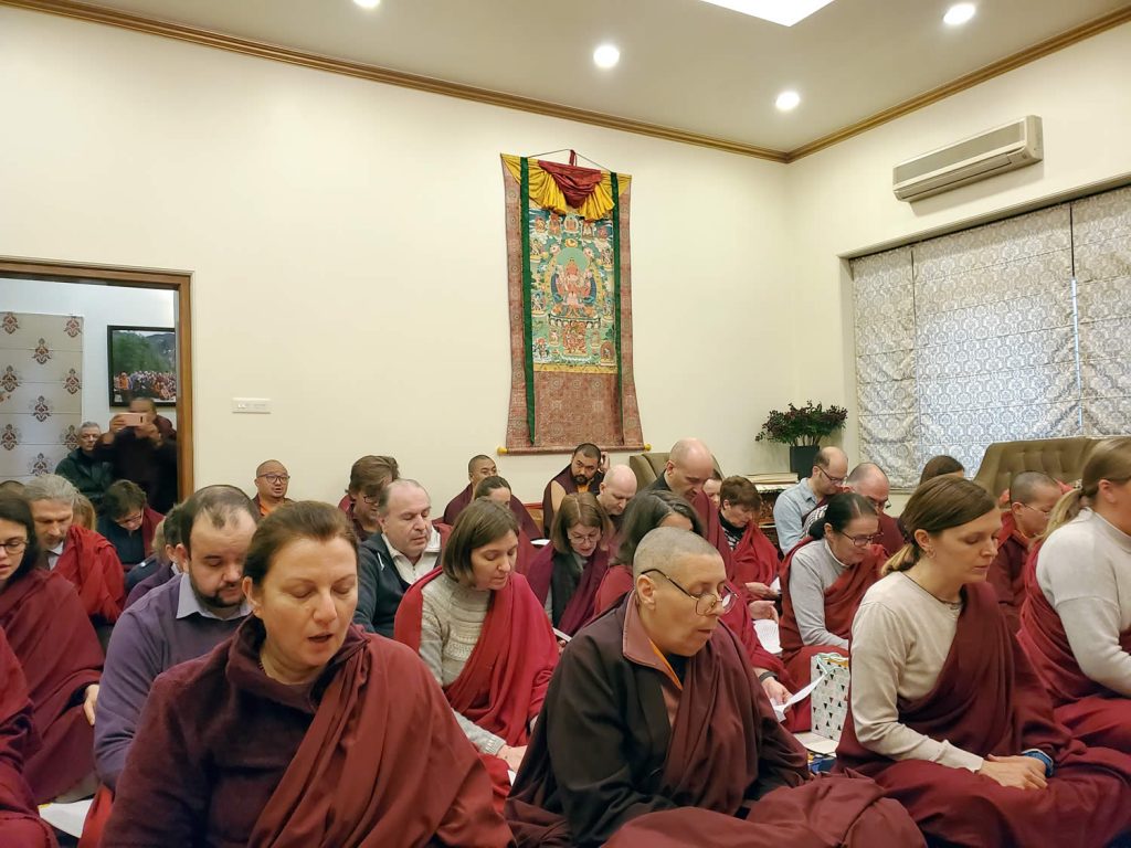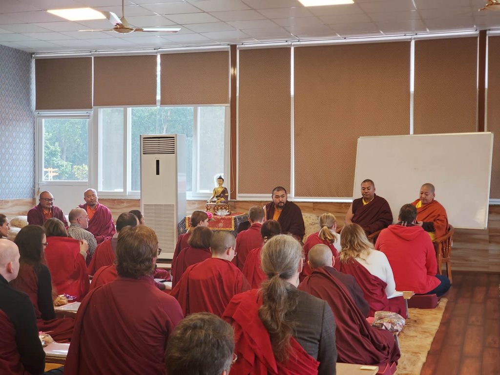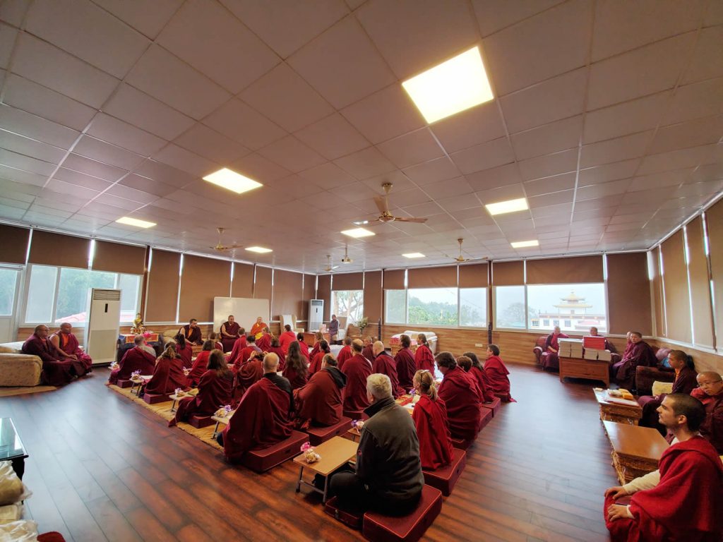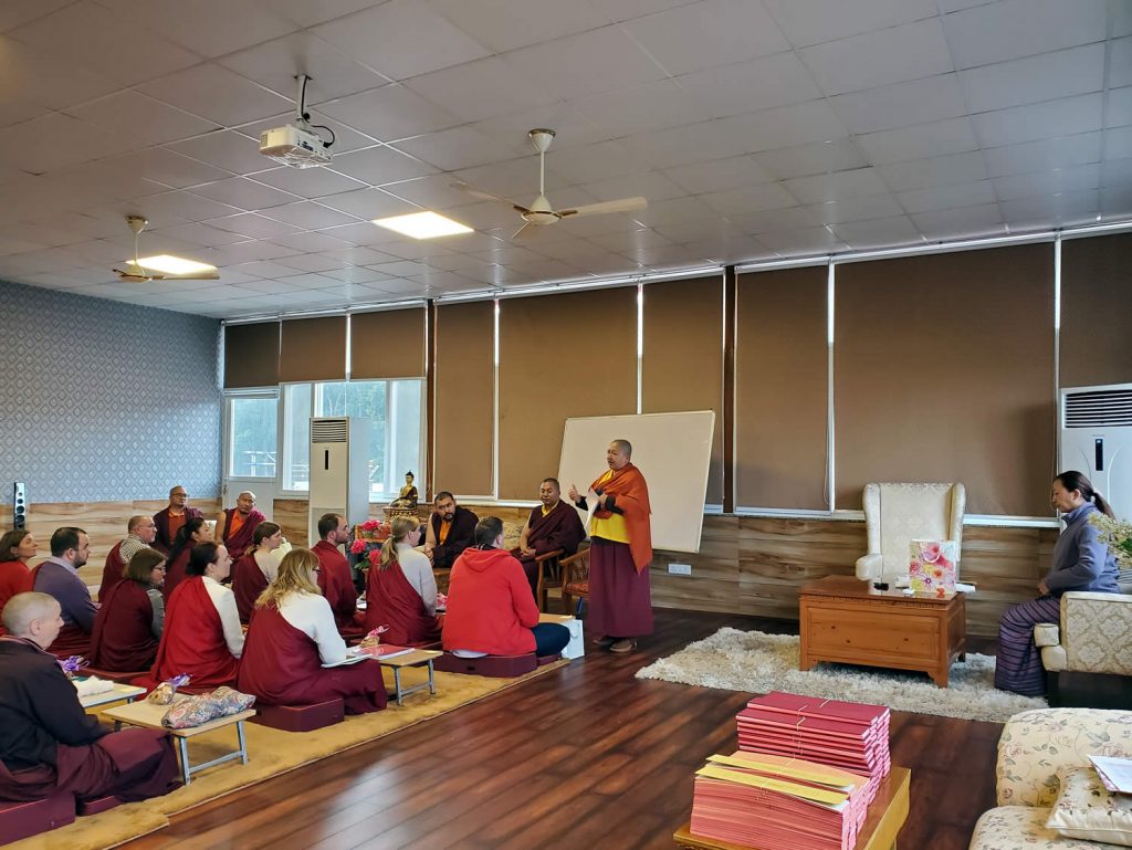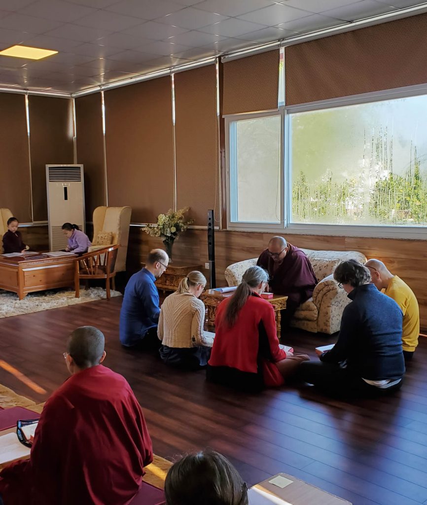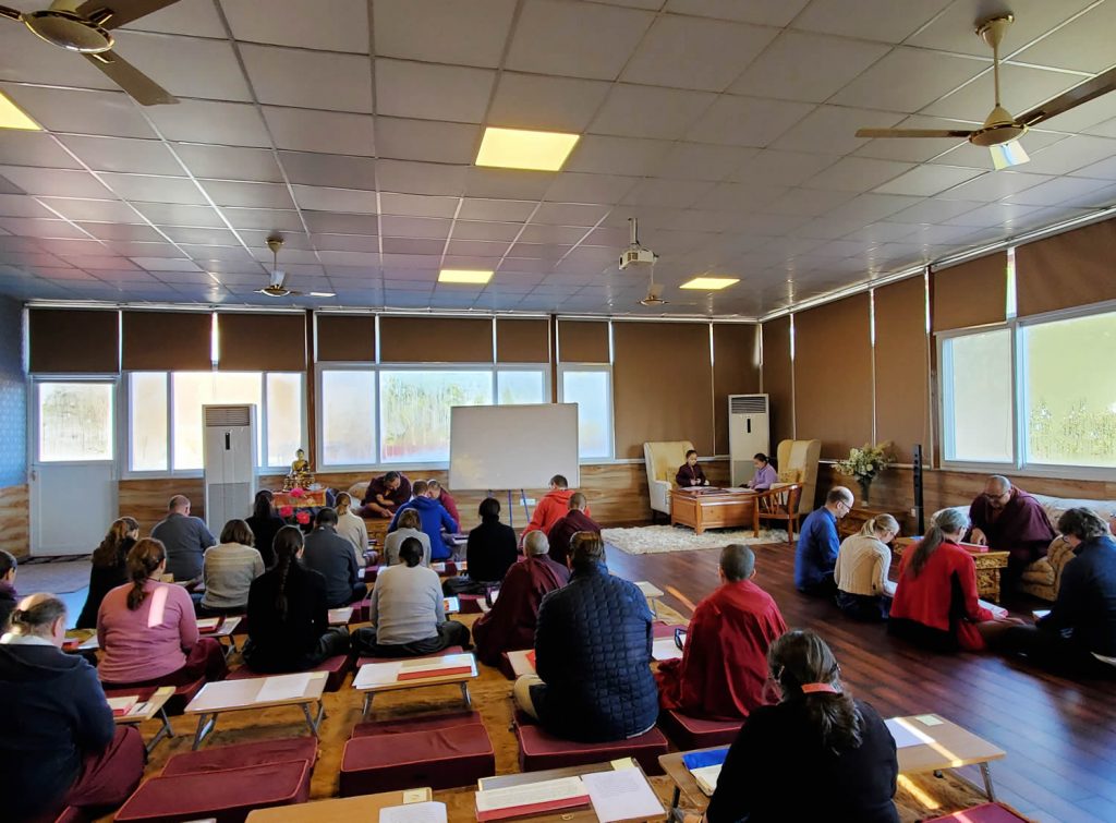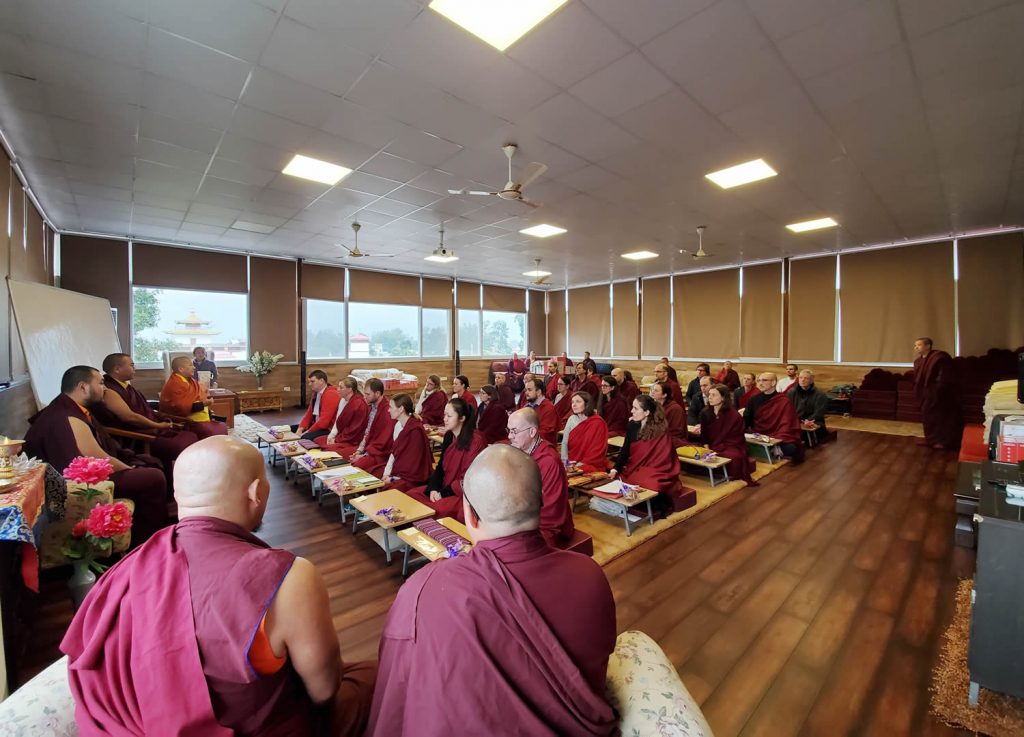 So it was with a mixture of excitement and great appreciation that students gathered at Mindrolling Monastery on the morning of January 4th. Led by Anila Yonten Zangmo and Anila Tsultrim Dechen, the participants offered khatags at the magnificent monastery and stupa shrines, vividly reminding us of the journey towards enlightenment that is the reason for our presence here. In the afternoon, the students joined Jetsün Khandro Rinpoche, Jetsunla, Jetsün Rinpoche, Dungse Rinpoche, and the teachers of the program, Ven. Uchen Choktrul Jigdral Kuenga Rinpoche, Ven. Khenpo Namdral Gyatso, Ven. Gen Sonam Tobgyal la, and Ven. Gen Namdrol Zangpo la, in the kudung shrine room to offer prayers for the auspicious opening of the program.