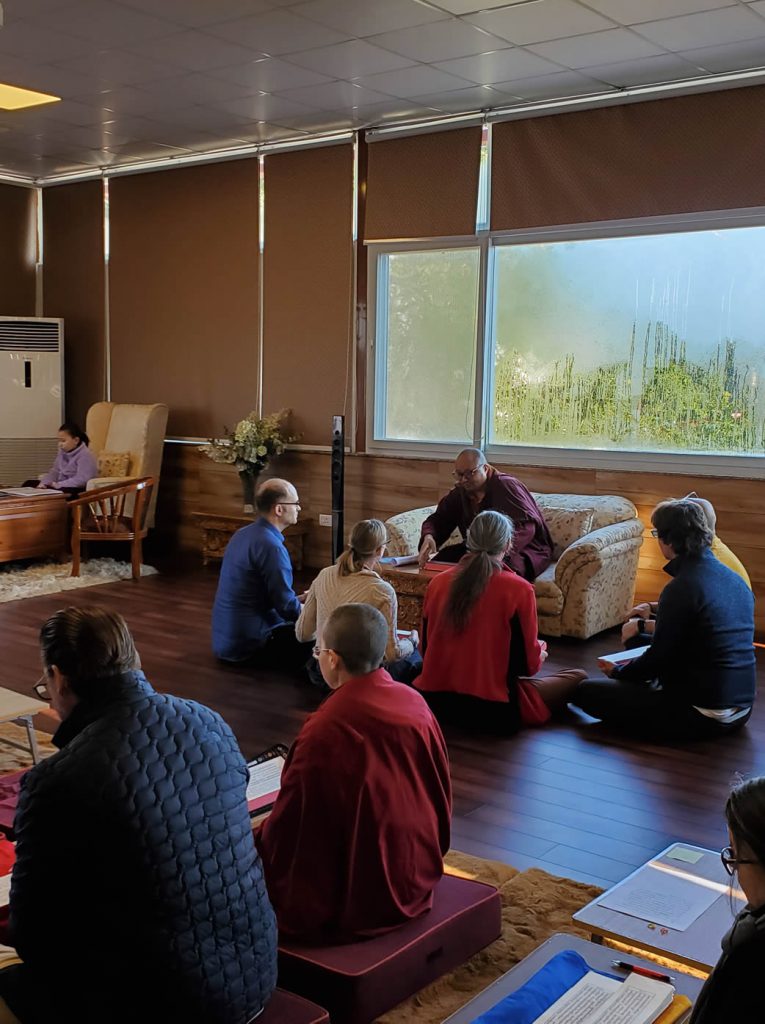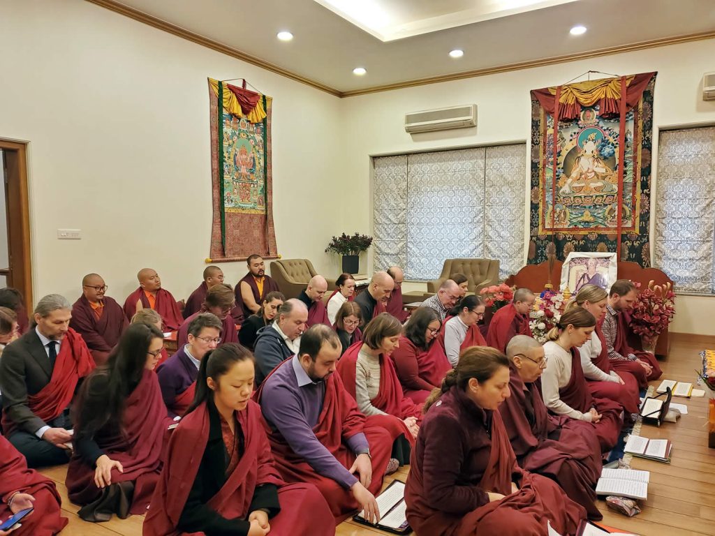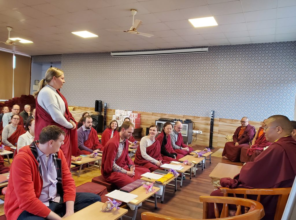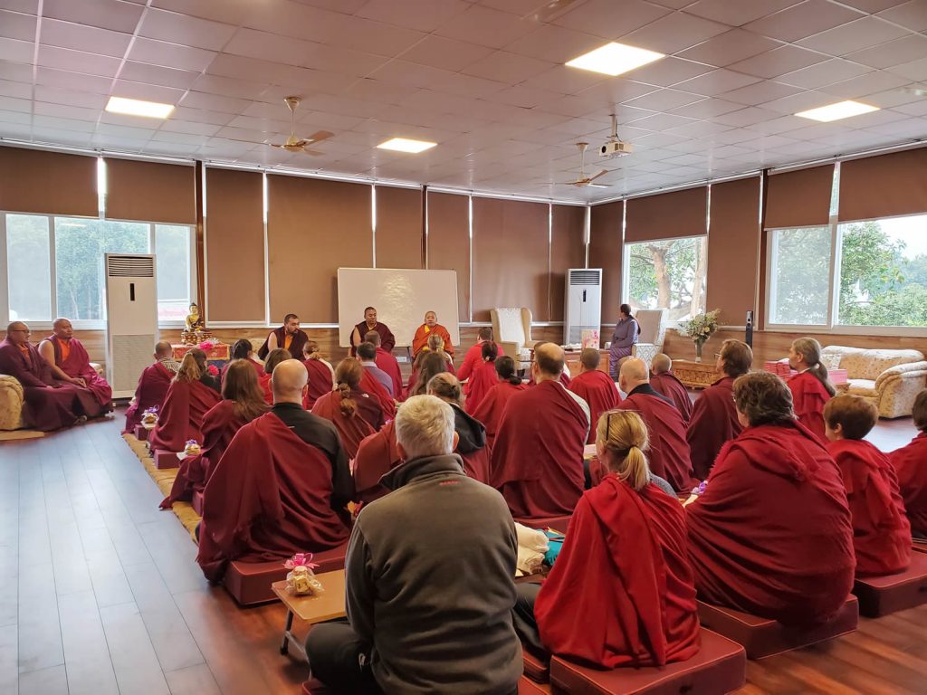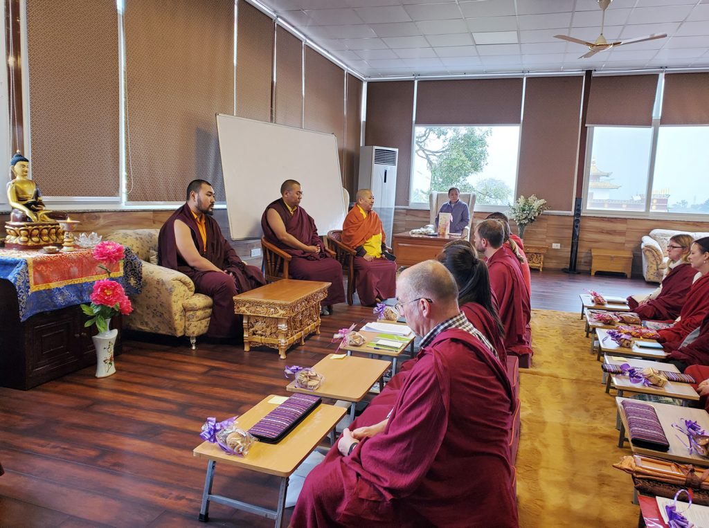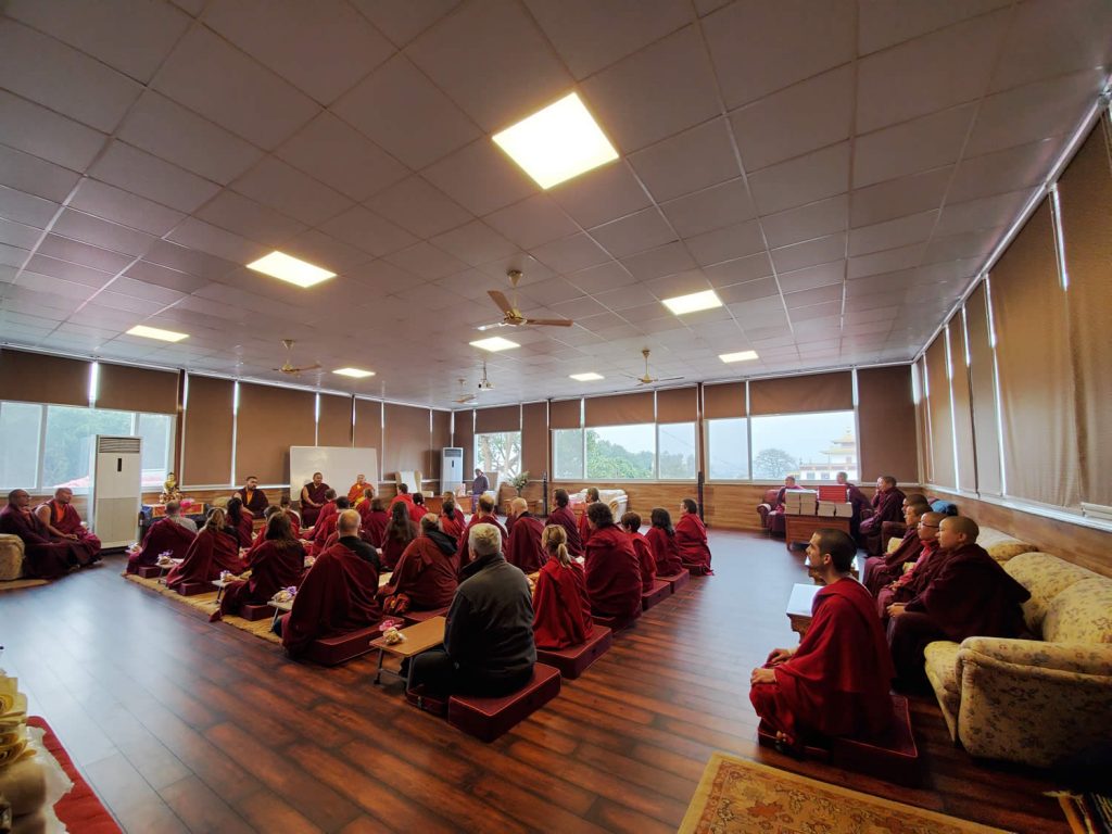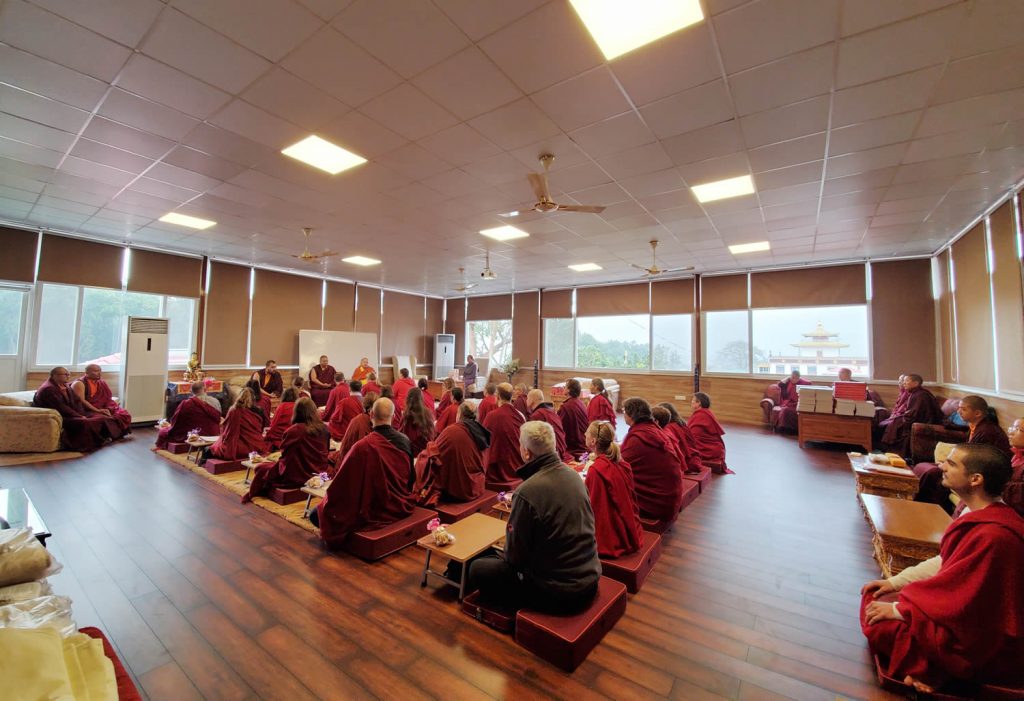 So it was with a mixture of excitement and great appreciation that students gathered at Mindrolling Monastery on the morning of January 4th. Led by Anila Yonten Zangmo and Anila Tsultrim Dechen, the participants offered khatags at the magnificent monastery and stupa shrines, vividly reminding us of the journey towards enlightenment that is the reason for our presence here. In the afternoon, the students joined Jetsün Khandro Rinpoche, Jetsunla, Jetsün Rinpoche, Dungse Rinpoche, and the teachers of the program, Ven. Uchen Choktrul Jigdral Kuenga Rinpoche, Ven. Khenpo Namdral Gyatso, Ven. Gen Sonam Tobgyal la, and Ven. Gen Namdrol Zangpo la, in the kudung shrine room to offer prayers for the auspicious opening of the program.