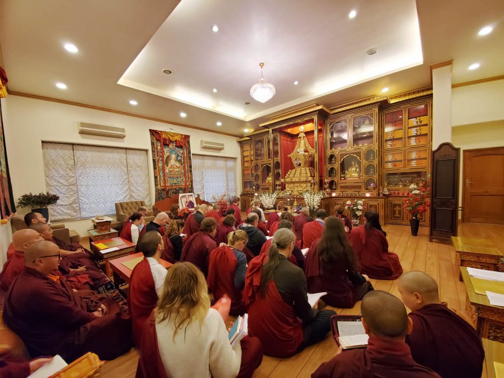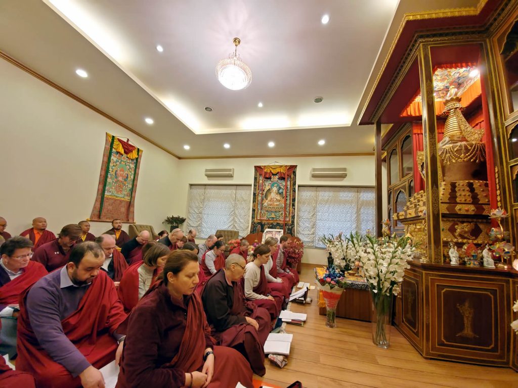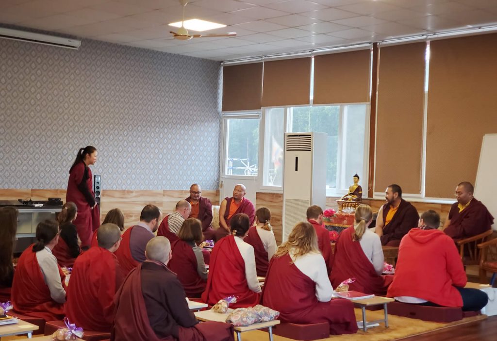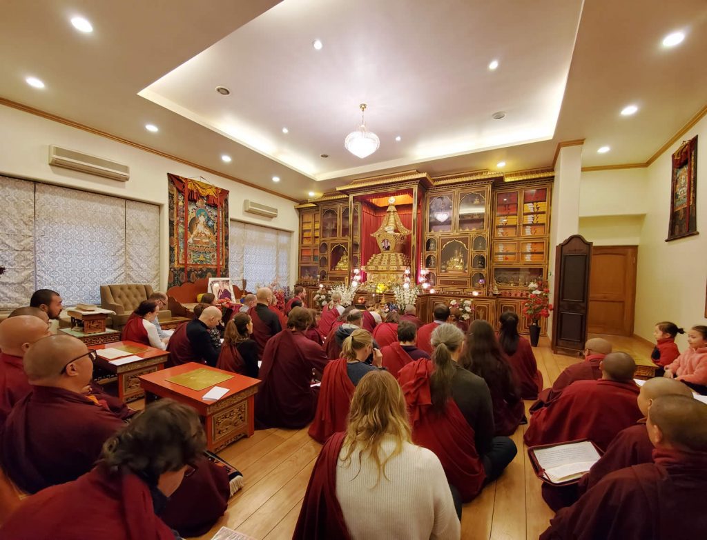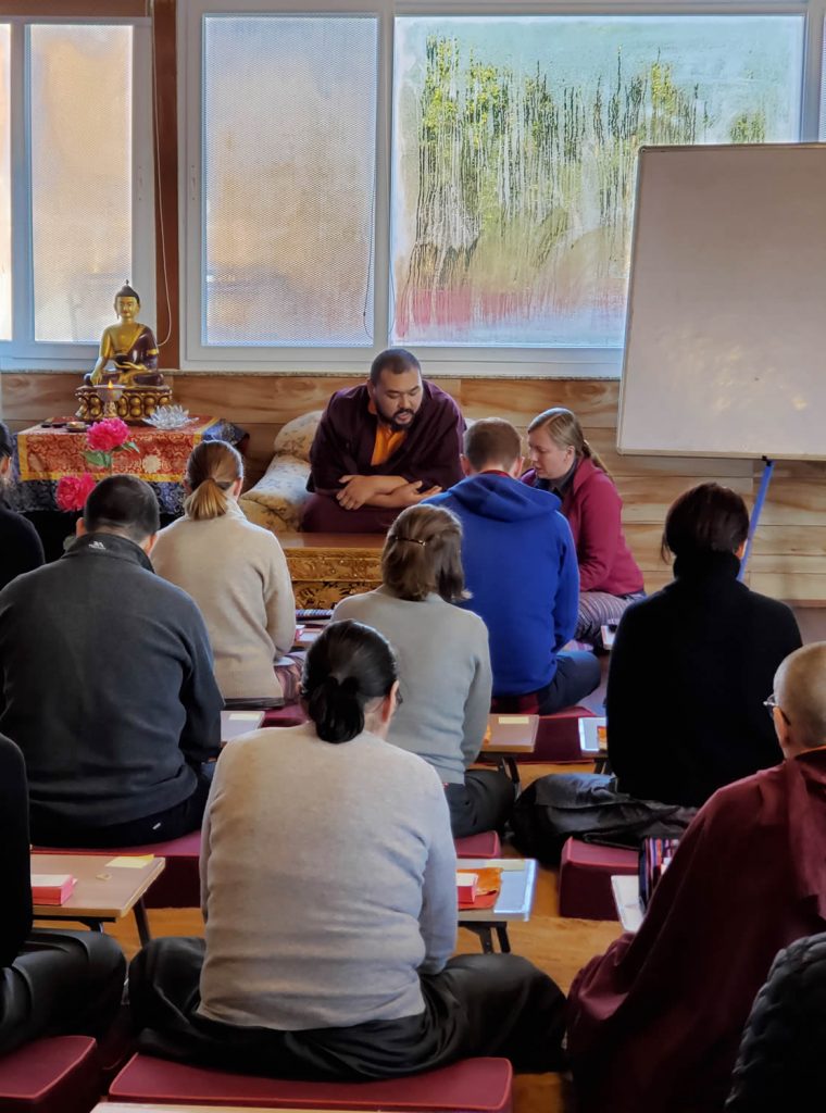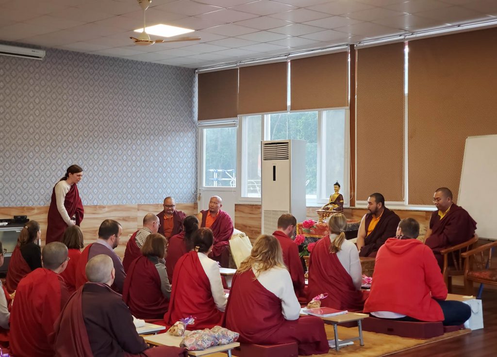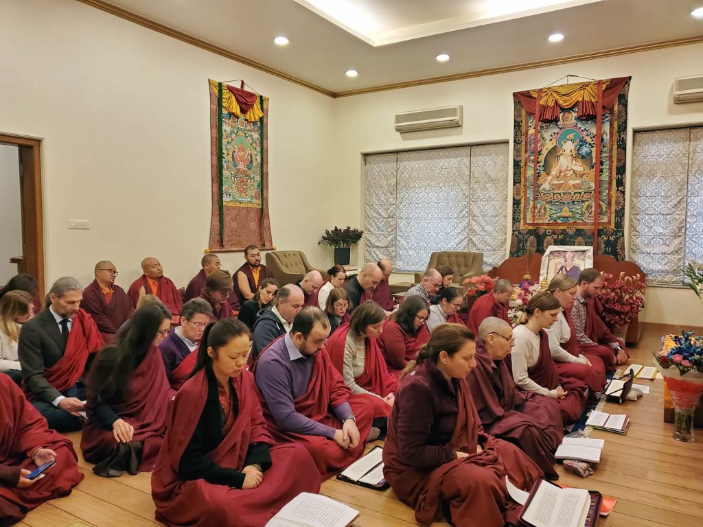 So it was with a mixture of excitement and great appreciation that students gathered at Mindrolling Monastery on the morning of January 4th. Led by Anila Yonten Zangmo and Anila Tsultrim Dechen, the participants offered khatags at the magnificent monastery and stupa shrines, vividly reminding us of the journey towards enlightenment that is the reason for our presence here. In the afternoon, the students joined Jetsün Khandro Rinpoche, Jetsunla, Jetsün Rinpoche, Dungse Rinpoche, and the teachers of the program, Ven. Uchen Choktrul Jigdral Kuenga Rinpoche, Ven. Khenpo Namdral Gyatso, Ven. Gen Sonam Tobgyal la, and Ven. Gen Namdrol Zangpo la, in the kudung shrine room to offer prayers for the auspicious opening of the program.
