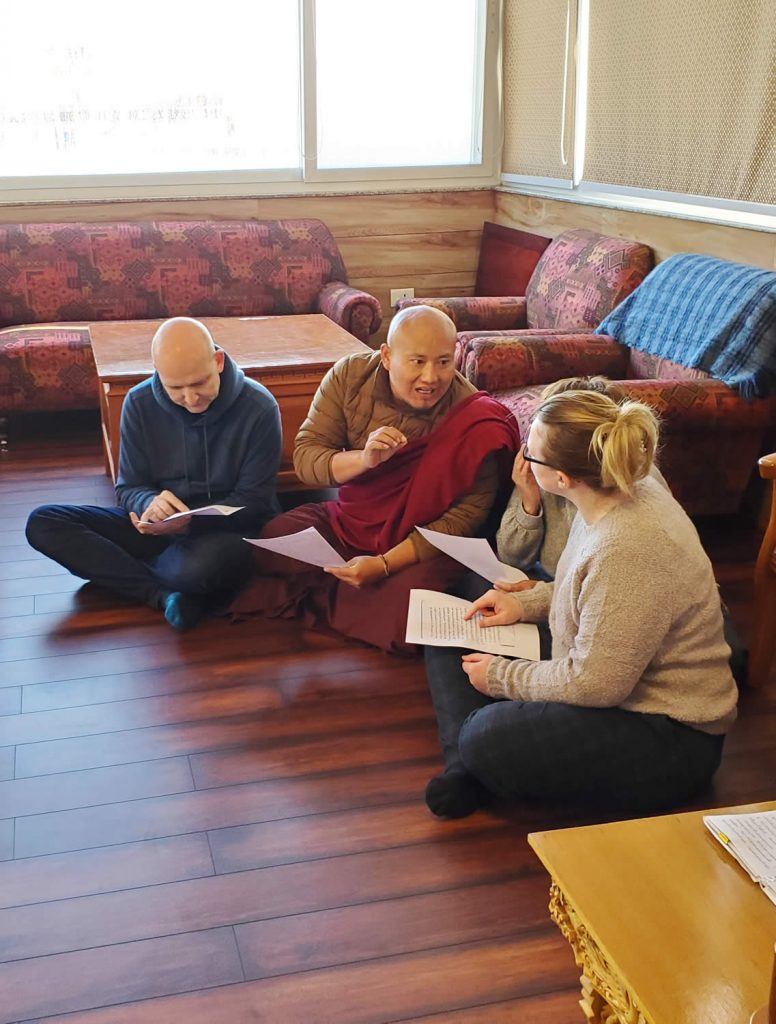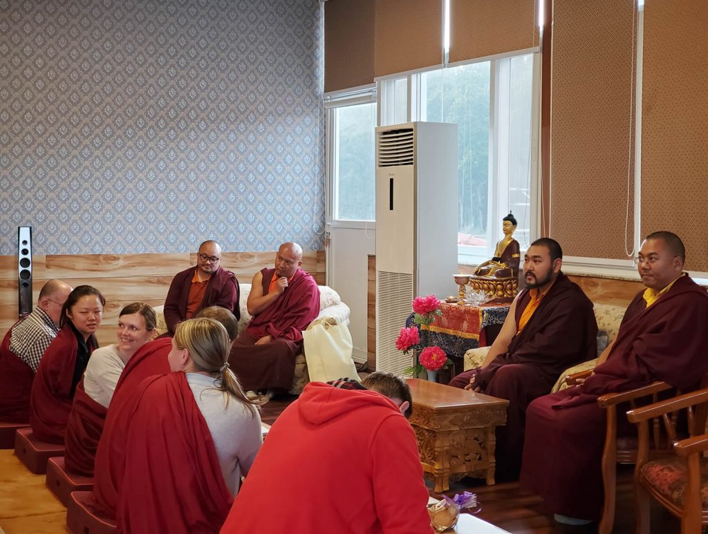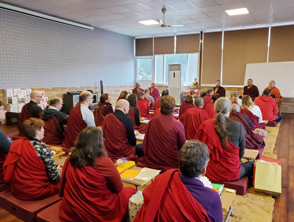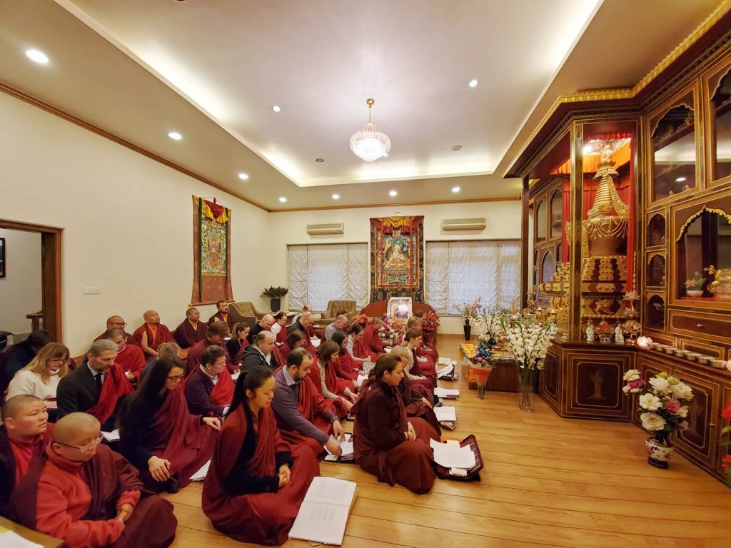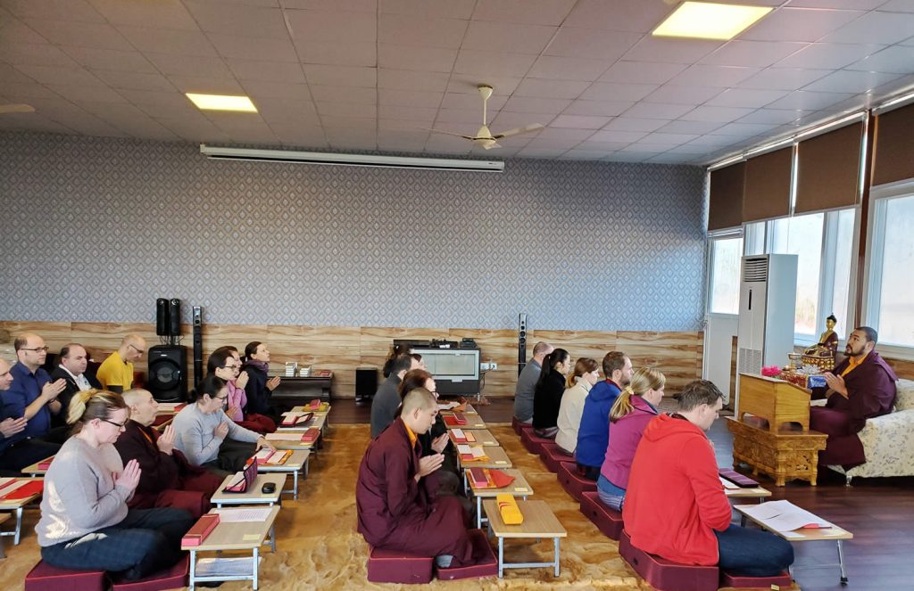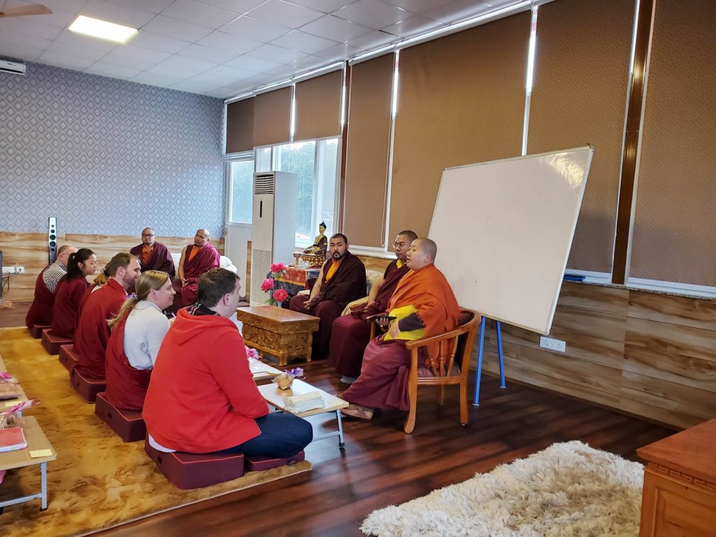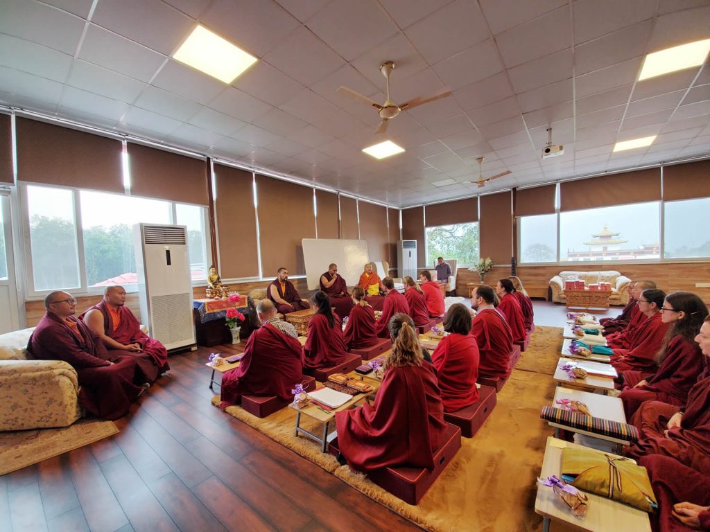 So it was with a mixture of excitement and great appreciation that students gathered at Mindrolling Monastery on the morning of January 4th. Led by Anila Yonten Zangmo and Anila Tsultrim Dechen, the participants offered khatags at the magnificent monastery and stupa shrines, vividly reminding us of the journey towards enlightenment that is the reason for our presence here. In the afternoon, the students joined Jetsün Khandro Rinpoche, Jetsunla, Jetsün Rinpoche, Dungse Rinpoche, and the teachers of the program, Ven. Uchen Choktrul Jigdral Kuenga Rinpoche, Ven. Khenpo Namdral Gyatso, Ven. Gen Sonam Tobgyal la, and Ven. Gen Namdrol Zangpo la, in the kudung shrine room to offer prayers for the auspicious opening of the program.