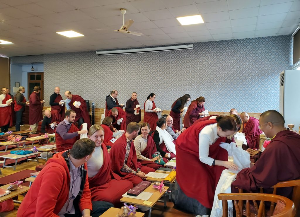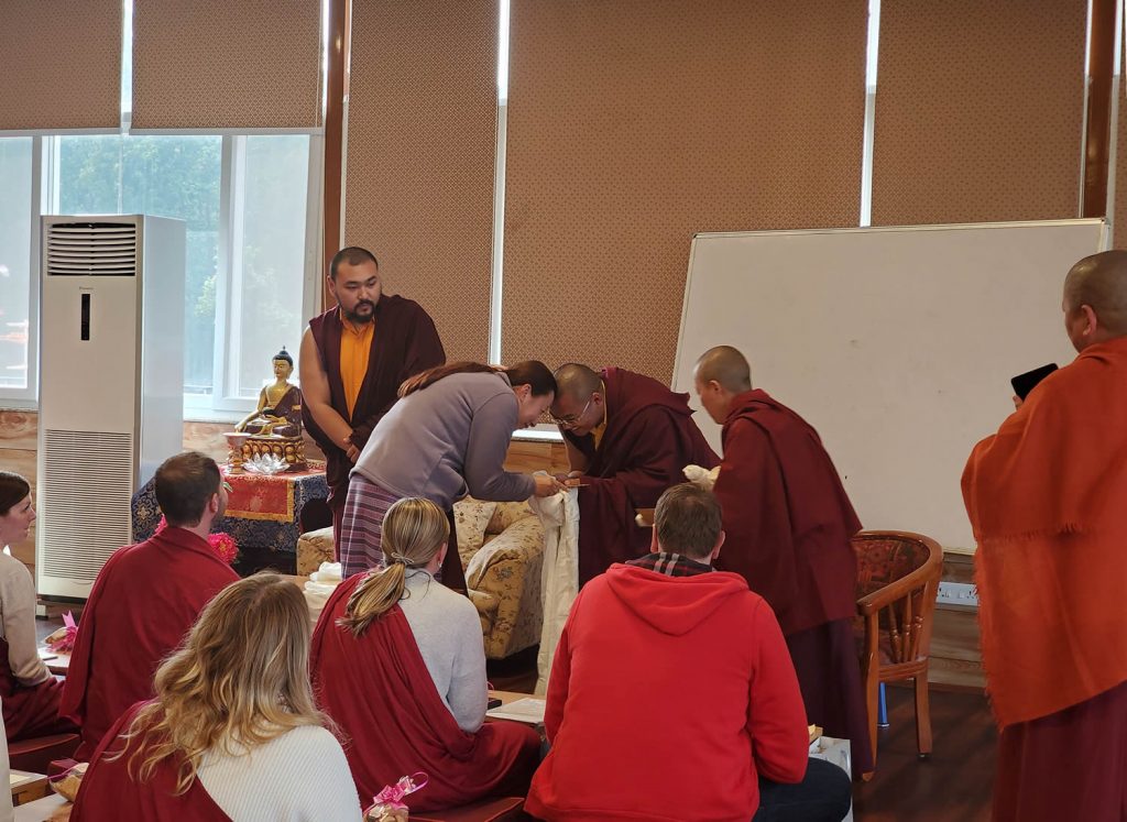 The group then proceeded to the upper hall classroom, where Rinpoche described her vision for the Mindrol Lekshey program, and introduced each of the teachers of the program. After students offered mandala and khatags to each of the teachers, they introduced themselves to their teachers, telling them who they were, where they were from and a bit about their study and practice background. Selected students then made presentations on their intent and aspirations for the program, highlighting the historic nature of this endeavor, their gratitude for being included, and their hopes for the transmission of the dharma in the west, to the assembly. At the close of the ceremony, Rinpoche, Jetsunla and the nuns presented each of the participants all items necessary for their study and practice, such as the collection of all texts and instructions books, practice shawls and clothing, and many gift items such as hot water bottles, electric blankets, kettles and dishes and other basic amenities. The day ended joyously with a celebratory dinner.