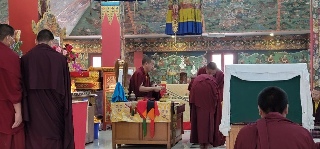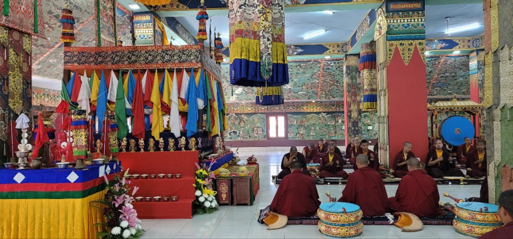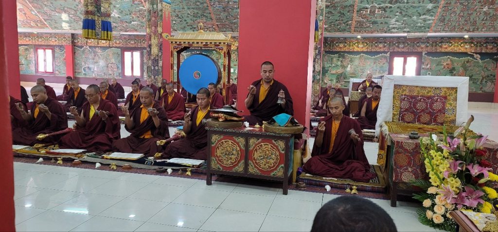 Following Losar, on Saturday, March 12th, 2022, Mindrolling Monastery began the great Thug Je Chenpo drubchen, or the Drubchen of the Great Compassionate One. This annual 7-day drubchen is performed every year in commemoration of the anniversary of the Parinirvana of Kyabje Minling Trichen. The Thug Je Chenpo terma was revealed by Chögyal Terdag Lingpa and it is considered to be especially beneficial during this era when merit and virtue are weak. Knowing that generation after generation of the Mindrolling lineage have manifested as the Great Compassionate One (Thug Je Chenpo) for the benefit of beings, each year the sangha of Mindrolling performs this profound mahasadhana with great joy and devotion and with the aspiration that the Dharma will continue to flourish and that the activities of our teachers will be as vast as the sky. The merit of this practice is dedicated to the benefit and liberation of all sentient beings and the continued flourishing of the Mindrolling lineage.