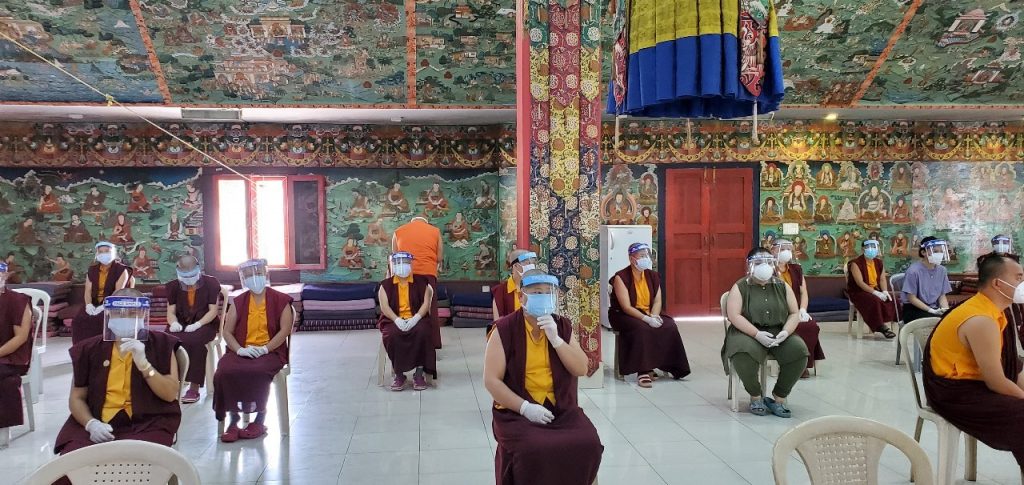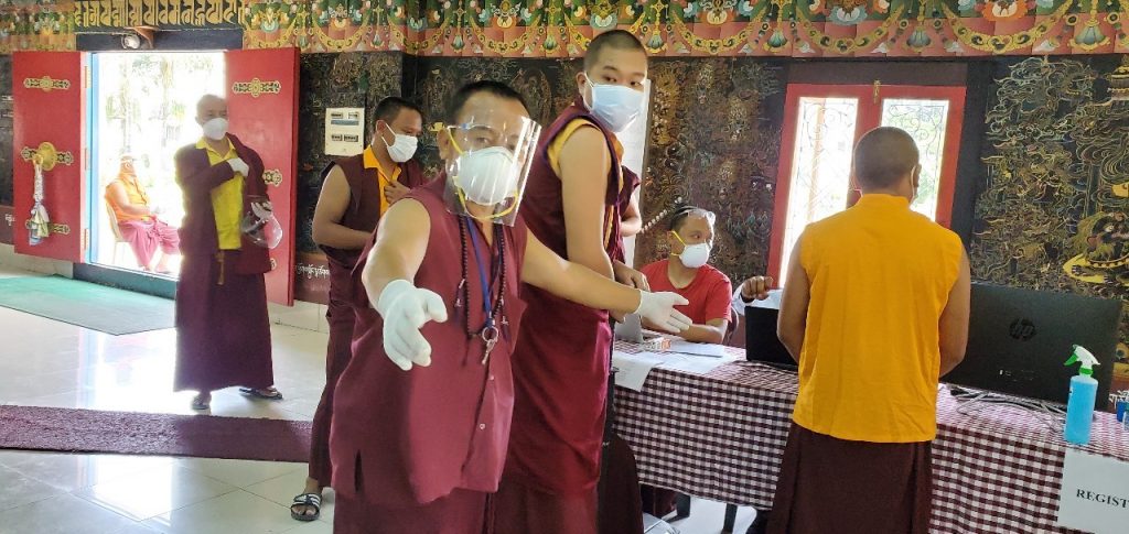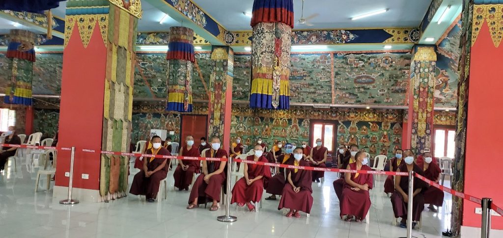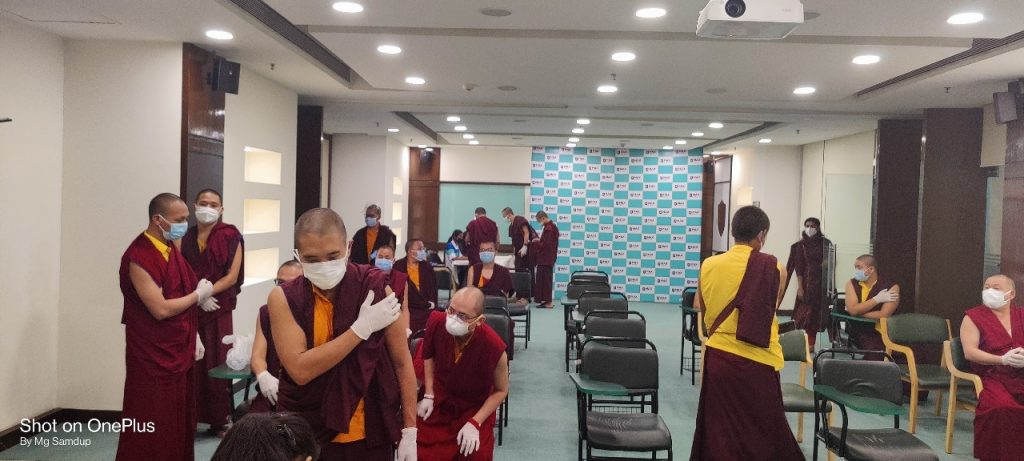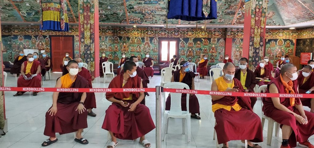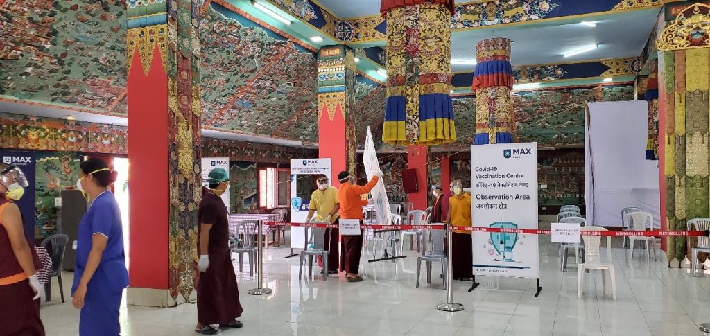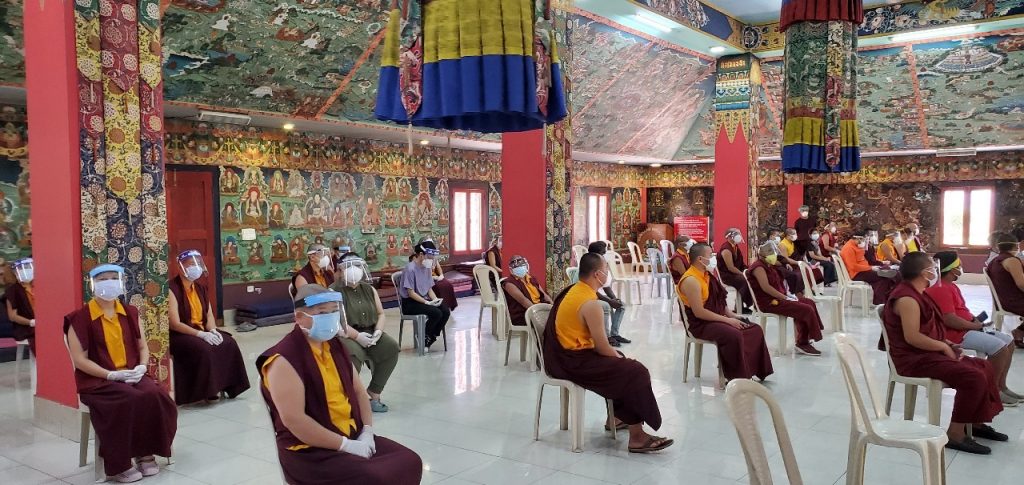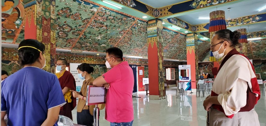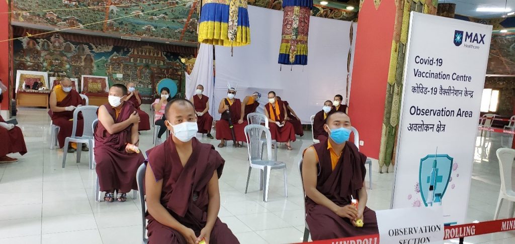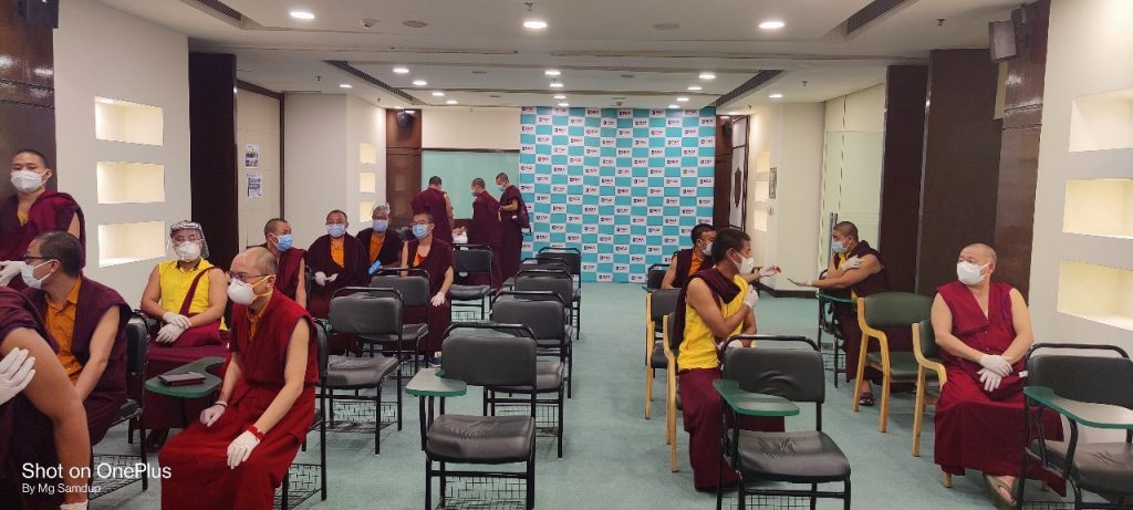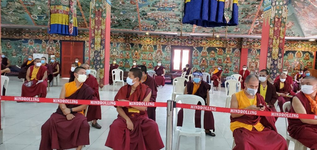 As India faced incredible challenges during the most recent wave of COVID-19, the administration team of Mindrolling Monastery worked tirelessly to protect the safety of the monks and the lay community. Facing such a crisis with shortages of so many needed supplies, the team did widespread testing, treated all those who tested positive and contained the spread of the virus using quarantines and contact tracing. After weeks of hard work, the spread of the virus within the Clement Town Tibetan Colony was contained and the safety of those in the colony has been successfully secured. Once the situation was controlled and the safety of the community had been secured, Mindrolling Monastery organized a huge vaccination effort to get the entire monastic community of Mindrolling and the Tibetan colony vaccinated. The clinic took place in the Guru Rinpoche shrine room of the stupa at Mindrolling Monastery.