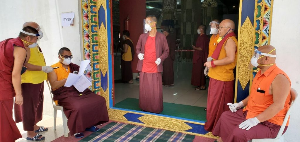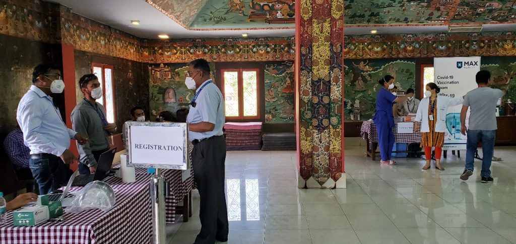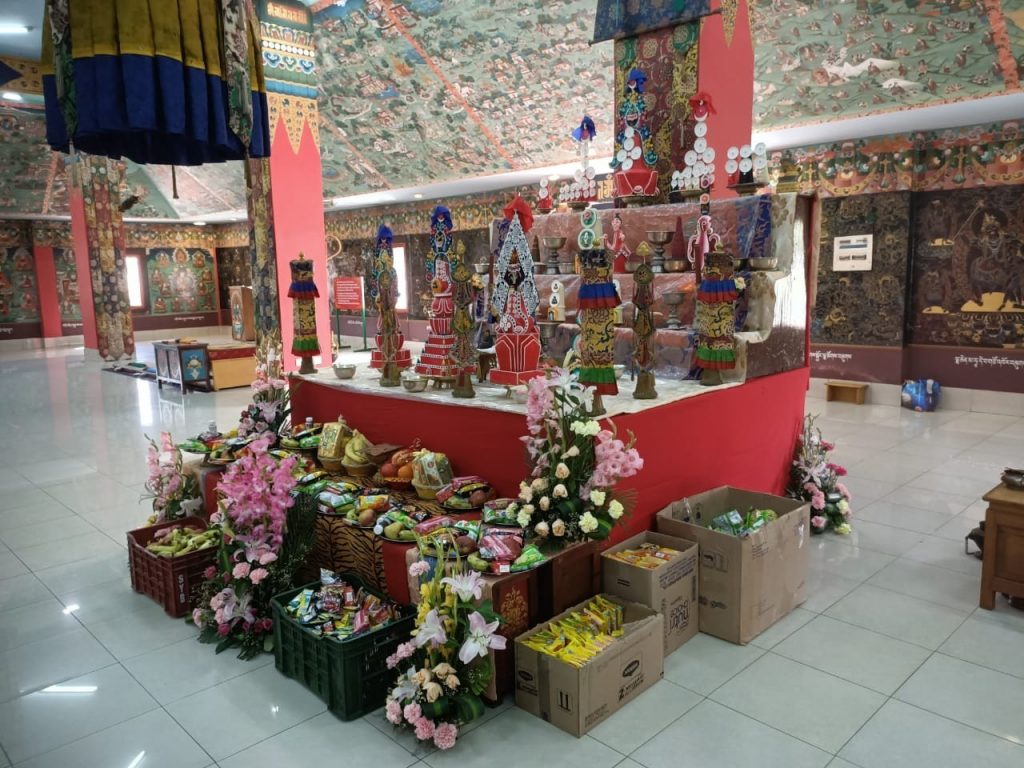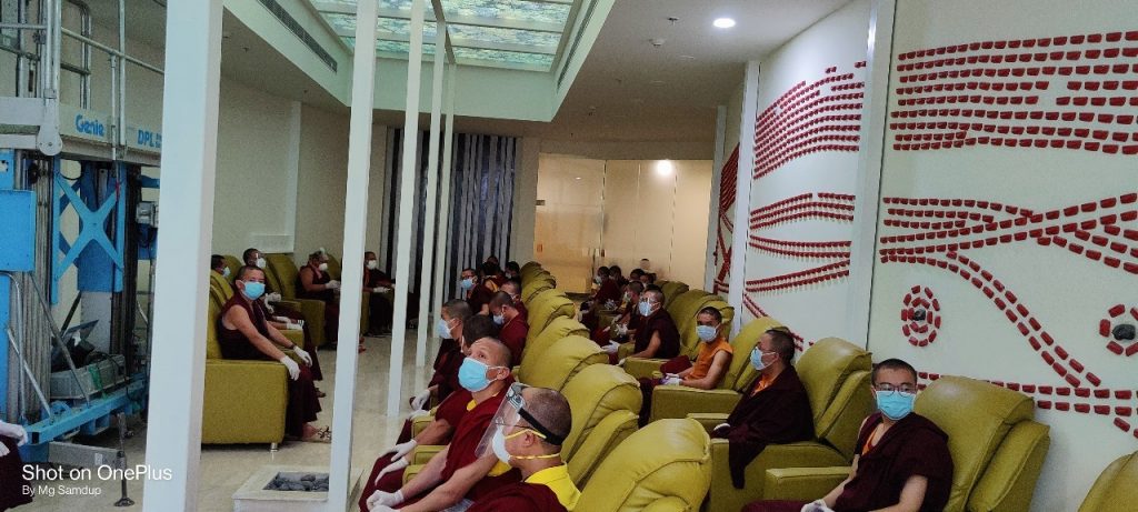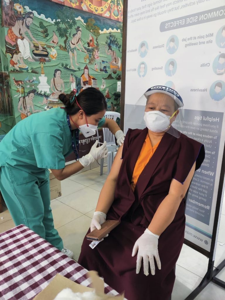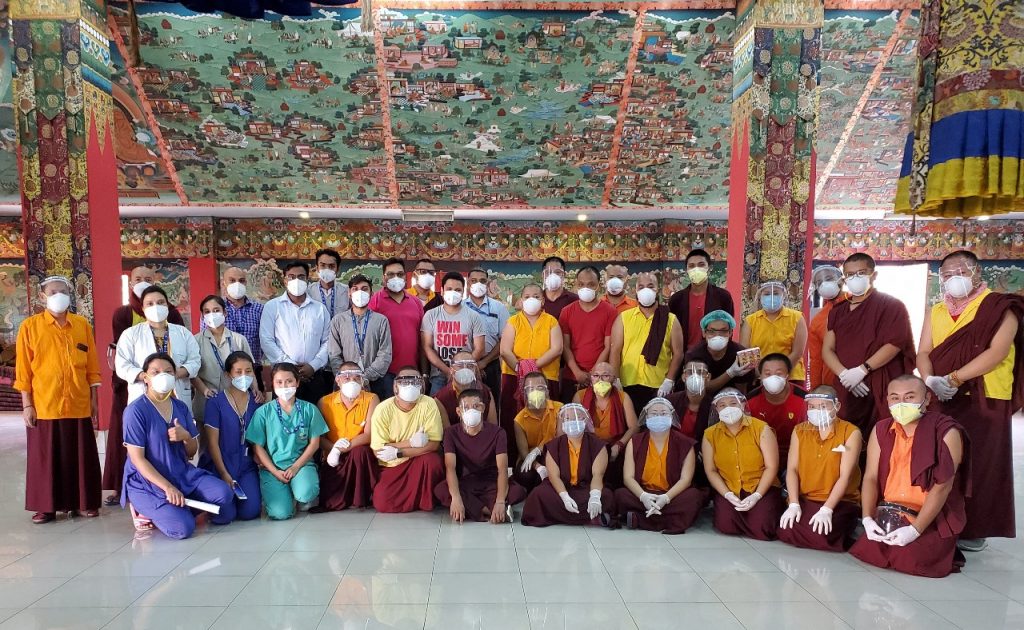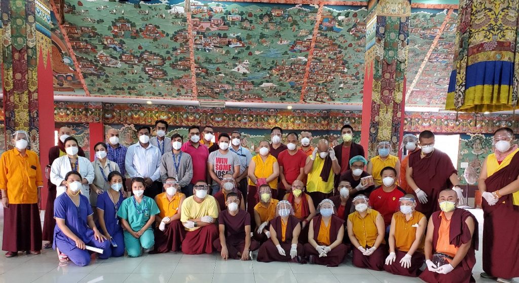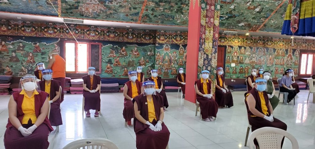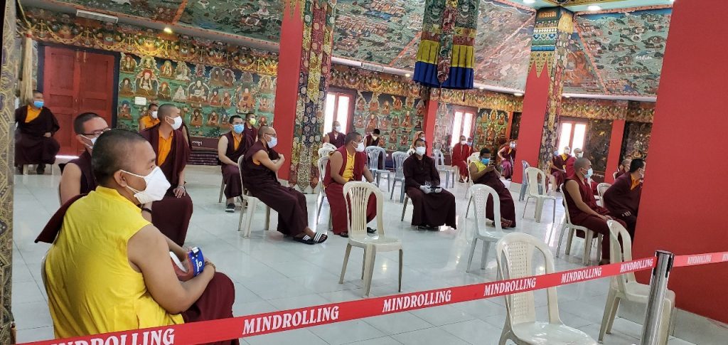 As India faced incredible challenges during the most recent wave of COVID-19, the administration team of Mindrolling Monastery worked tirelessly to protect the safety of the monks and the lay community. Facing such a crisis with shortages of so many needed supplies, the team did widespread testing, treated all those who tested positive and contained the spread of the virus using quarantines and contact tracing. After weeks of hard work, the spread of the virus within the Clement Town Tibetan Colony was contained and the safety of those in the colony has been successfully secured. Once the situation was controlled and the safety of the community had been secured, Mindrolling Monastery organized a huge vaccination effort to get the entire monastic community of Mindrolling and the Tibetan colony vaccinated. The clinic took place in the Guru Rinpoche shrine room of the stupa at Mindrolling Monastery.